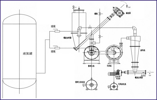 2、工作原理:該系統(tǒng)以液氮為冷源,被粉碎物料通過冷卻在低溫下實現(xiàn)脆化易粉碎狀態(tài)后,進入機械粉碎機腔體內(nèi),通過葉輪高速旋轉(zhuǎn),物料與葉片、齒盤、物料與物料之間的相互反復(fù)沖擊、碰撞、剪切、磨擦等綜合作用下,達到粉碎效果:被粉碎后的物料由旋風(fēng)出料進行收集;沒有達到細度要求的物料返回料倉繼續(xù)粉碎,冷氣大部分返回料倉循環(huán)使用。